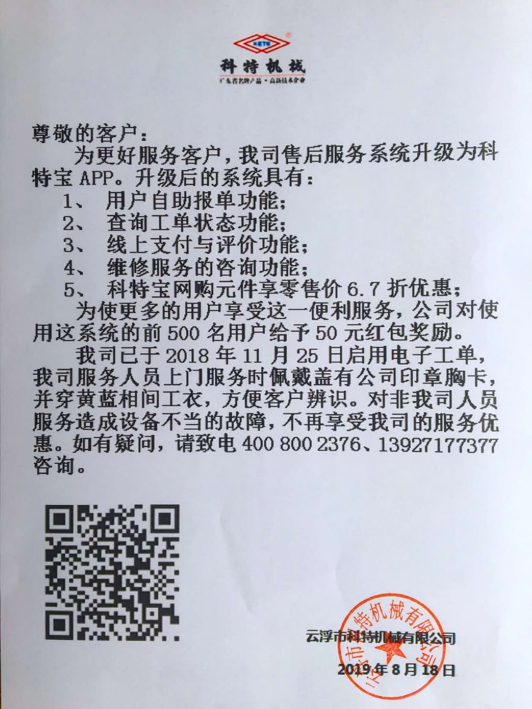 為更好的服務(wù)廣大客戶,實(shí)現(xiàn)更高效、更快速、更專業(yè)的售后服務(wù),科特機(jī)械擁抱互聯(lián)網(wǎng)資訊時代,將我司售后服務(wù)系統(tǒng)升級為科特寶A......