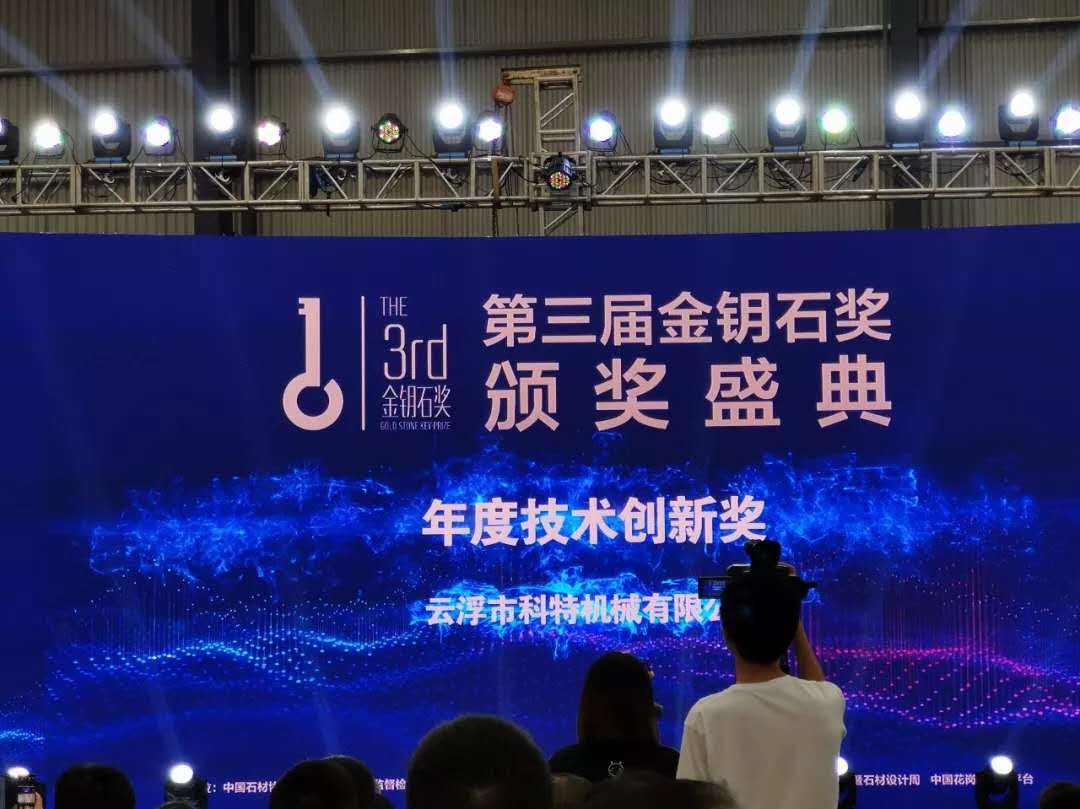 2019年11月8日下午,年度行業盛會“第三屆金鑰石獎頒獎盛典”在中國水頭石材產業展示運營中心隆重舉行。科特機械憑借行業首創、自主研發的“石材信息化3P解決方案”,繼【中國建材行業技術革新一等獎】、【中國石材行業技術革新一等獎】后,又獲殊榮,摘取【第三屆金鑰石—年度技術創新獎】。